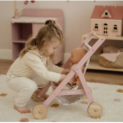 The sturdy wooden construction and rubber wheels ensure that the stroller rolls smoothly and keeps your floor protected. The seat is covered with the romantic Soft Flowers design, giving the stroller a charming appearance. Whether you play indoors or outdoors, with this stroller your doll can always comfortably join the adventure. Endless walking fun guaranteed!